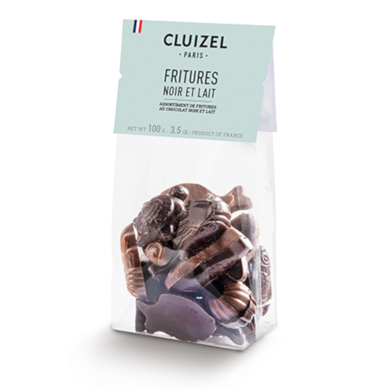 Le sachet Fritures de Pâques de la Chocolaterie CLUIZEL contient 100 g de chocolat au lait 39% et noir 63% de cacao. Une friture traditionnelle sur le thème de la mer.