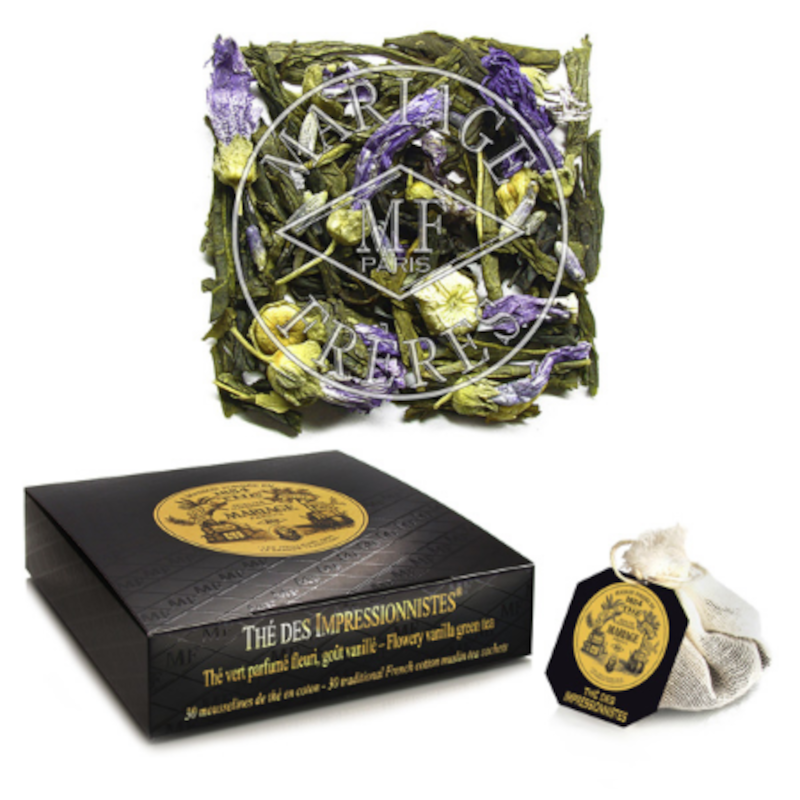 Ce thé vert parfumé d’épices douces et de fleurs blanches est parsemé de pétales de mauve qui évoquent les ciels indigo des impressionnistes.