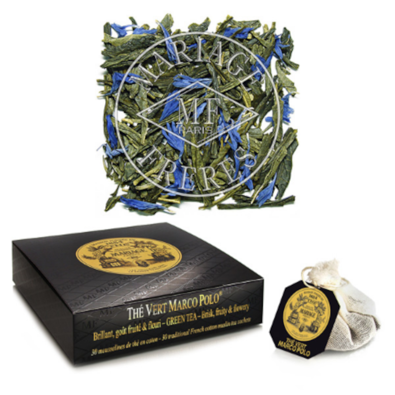 À un thé vert spécialement sélectionné pour sa saveur suave et naturelle s'associent les parfums secrets de fruits et de fleurs de Chine et du Tibet qui ont fait la réputation du thé Marco Polo.